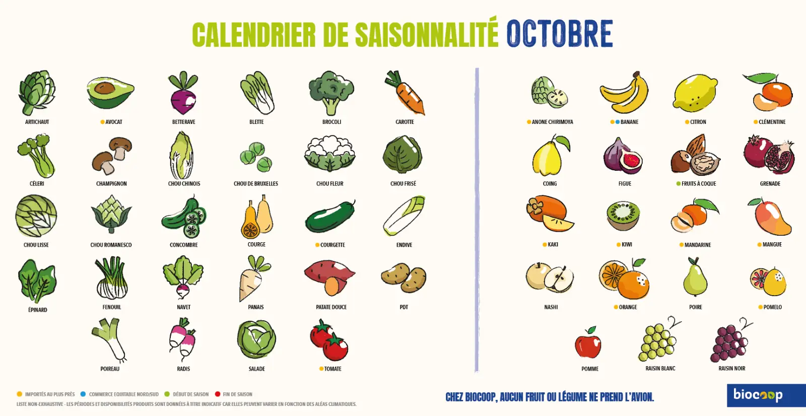 Parce que manger des produits de qualité rime avec respect de la saisonnalité, Biocoop a élaboré un calendrier de saisonnalité pour ses fruits et légumes bio.